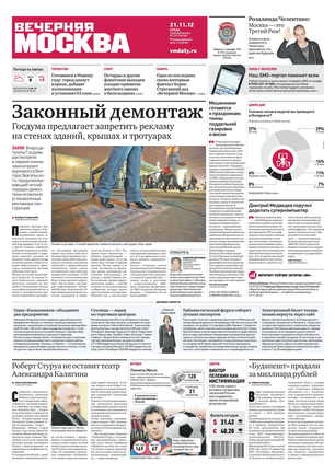 «Вечерняя Москва» — ежедневная российская вечерняя газета, старейшее из вечерних изданий в России, учрежденное в 1923 году. Выходит пять дней в неделю, кроме субботы и воскресенья. Отличается тем, что рассказывает о событиях еще не завершившегося дня. Оперативно освещает хронику и особенности жизни Москвы, охватывает все слои общества и большинство профессиональных и возрастных групп читателей.Издание представлено тремя выпусками – утренним ежедневным, вечерним (выходит три раза в неделю), еженедельным (выходит по четвергам).