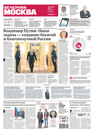 «Вечерняя Москва» — ежедневная российская вечерняя газета, старейшее из вечерних изданий в России, учрежденное в 1923 году. Выходит пять дней в неделю, кроме субботы и воскресенья. Отличается тем, что рассказывает о событиях еще не завершившегося дня. Оперативно освещает хронику и особенности жизни Москвы, охватывает все слои общества и большинство профессиональных и возрастных групп читателей.Издание представлено тремя выпусками – утренним ежедневным, вечерним (выходит три раза в неделю), еженедельным (выходит по четвергам).